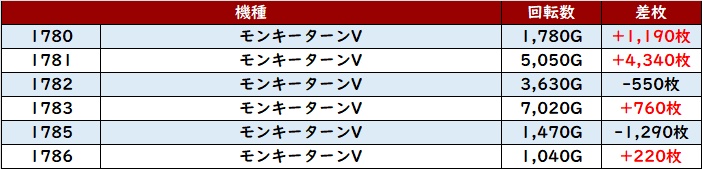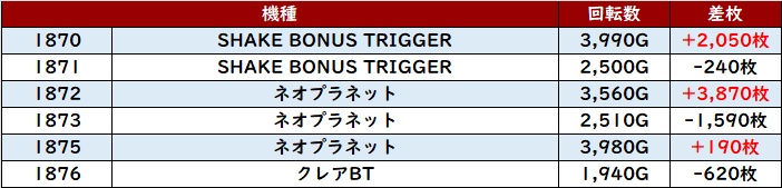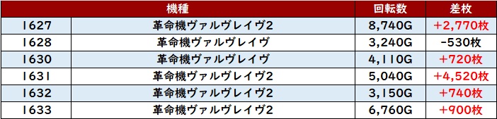 6台中4台がプラス差枚且つ半数が回転数7,080G越えと優秀な数値を残し、ユーザーの満足度の向上に大いに貢献した。