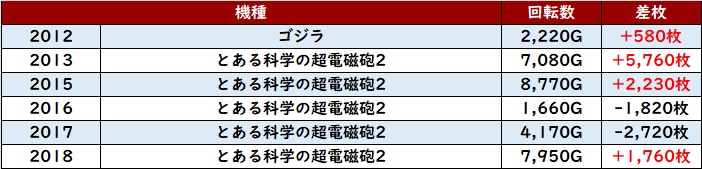 続いて「ゴジラ~とある超電磁砲2 2012~2018」が機種跨ぎで好調に!
