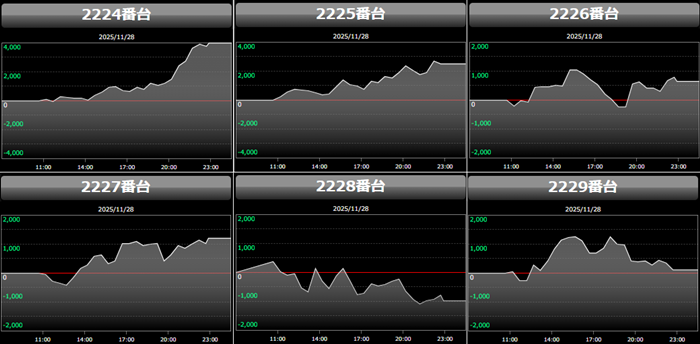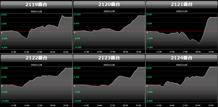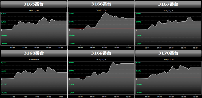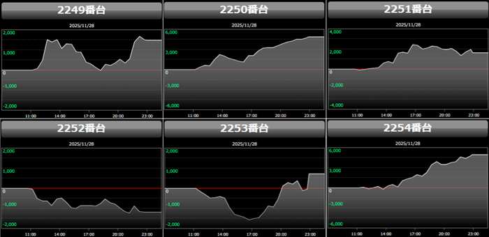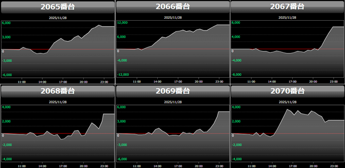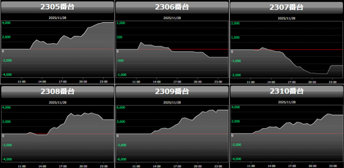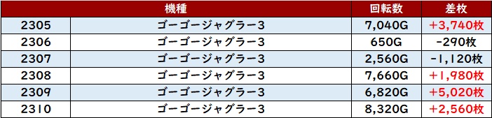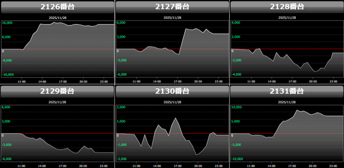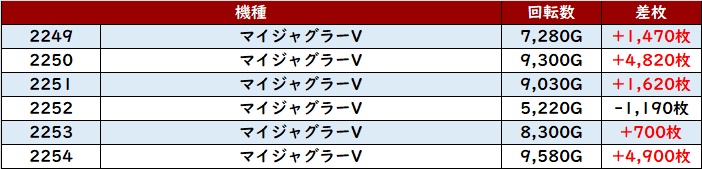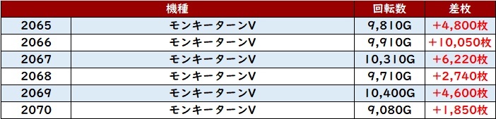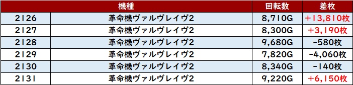 殆どが回転数9,700G超えに加え差枚数+2,700枚超えと文句なしの結果を残し、終日熱気溢れる一角となった。