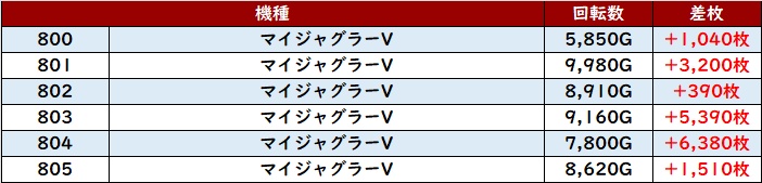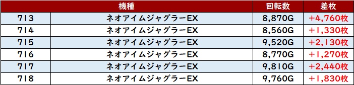 続いて「ネオアイム 713~718」「マイジャグ5 800~805」が2箇所、計12台全台プラス差枚と絶好調!