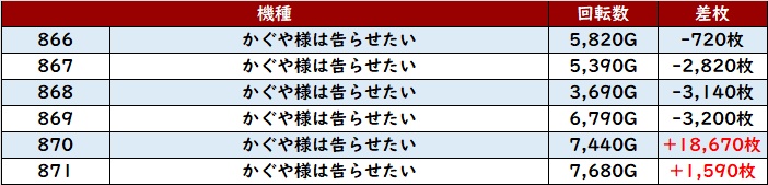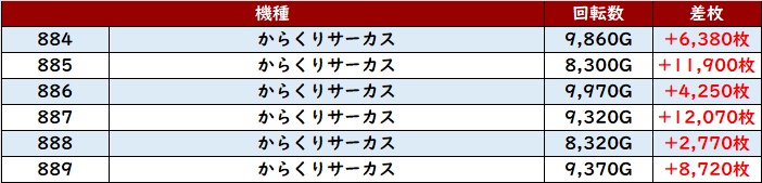 まずは「からくりサーカス 884~889」が全台大幅プラス差枚と安定感すら覚える結果に!