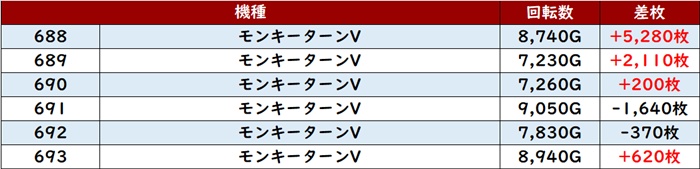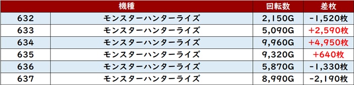 朝イチは「ヴヴヴ2」「東京喰種」「防振り」「モンキー5」が満台、「モンハンライズ」「DMC5ST」「沖ドキGOLD」が高稼働となった。