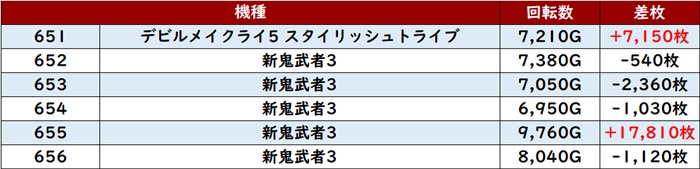 続いて「DMC5ST~新鬼武者3 651~656」から差枚数+17,810枚と破壊力満点の出玉感となる台を目撃!