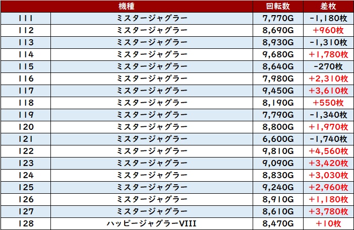 まずは「ミスター~ハッピー3 111~128」が抜群の稼働状況を伴って主役の座に!