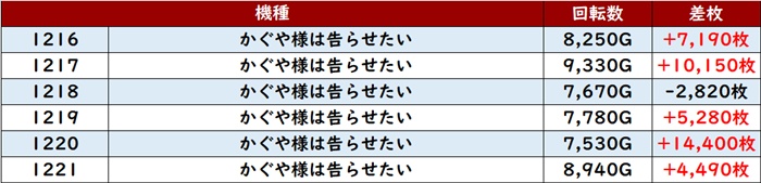 更に「かぐや様 1216~1221」も6台中5台がプラス差枚と高い勝率で存在感をアピール!