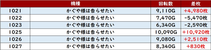 殆どが回転数9,000G超えとなる中で、勢いそのままに差枚数+6,130枚など大きな出玉感を見せていた。