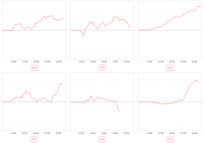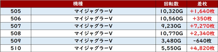 続いて「マイジャグ5 505~510」が大半が回転数9,200G超えと抜群の稼働の高さに!