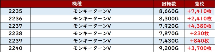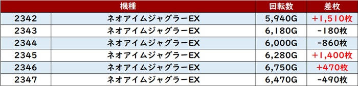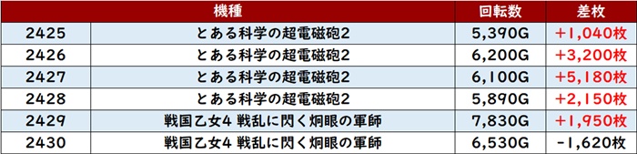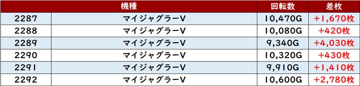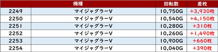 また「マイジャグ5 2249~2254、2287~2292」が計12台全台がプラス差枚と、Aタイプらしい安定感ある出玉感に!