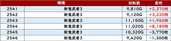 まずは「新鬼武者3 2563~2568」が全台回転数1万G超えと目を見張る結果に!