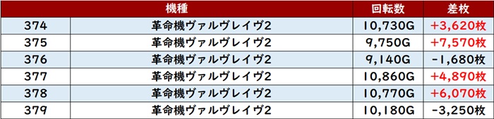 更に「ヴヴヴ2 374~379」の多くが回転数1万G超えの高稼働に!