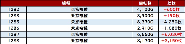 朝イチは「ヴヴヴ2」「東京喰種」「モンキー5」「キンハナ」「沖ドキゴージャス」の順で埋まった。