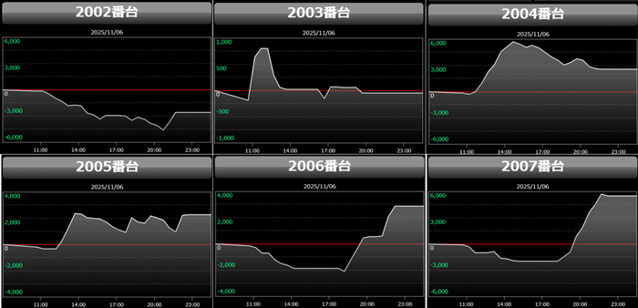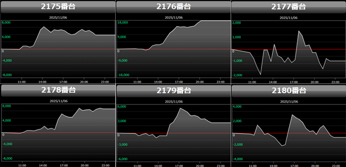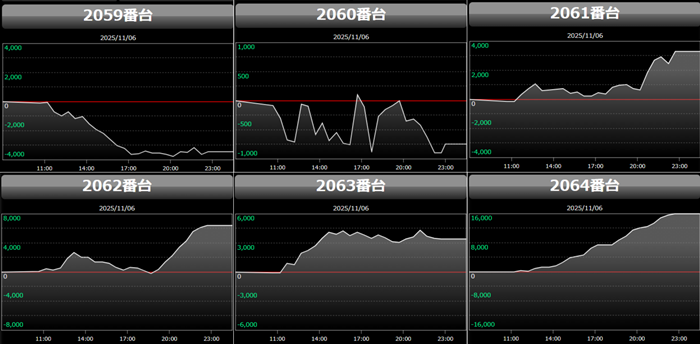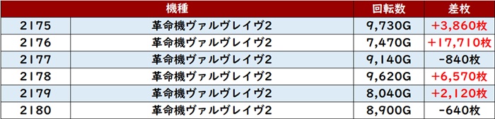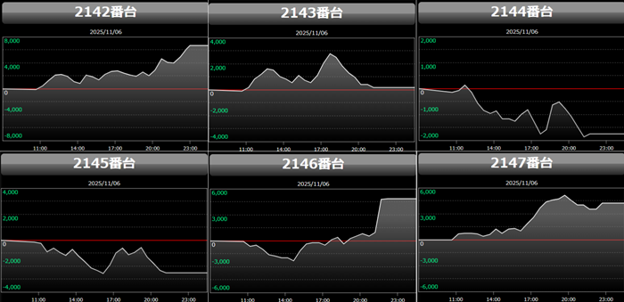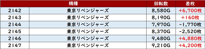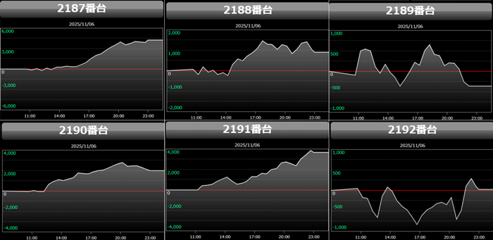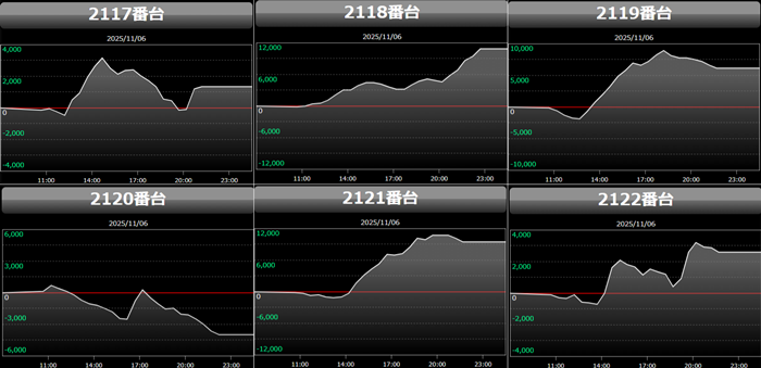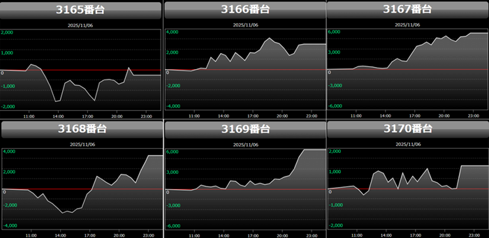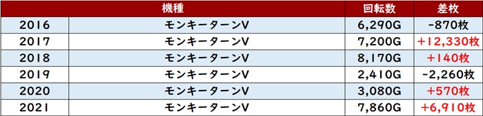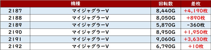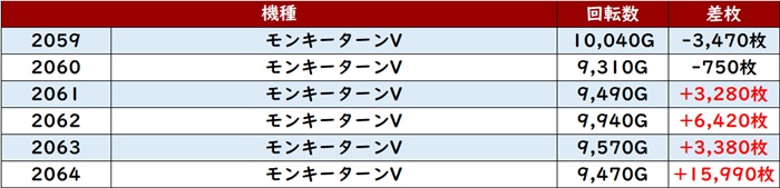 中でも「モンキー5 2059~2064」が回転数9,300G超えに加えて、差枚数+15,990枚が確認できるなど凄まじい熱気を放ち続けていた。
