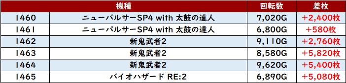 まずは「ニューパルSP4~バイオRE2 1460~1465」がメダル機3機種を跨いで大盛況に!