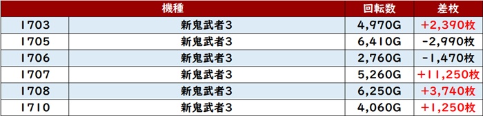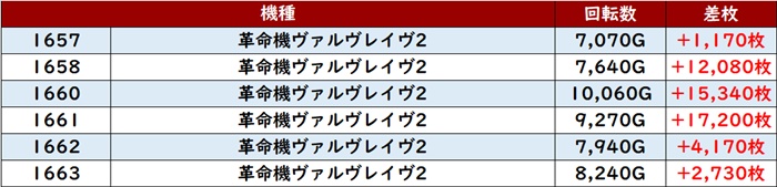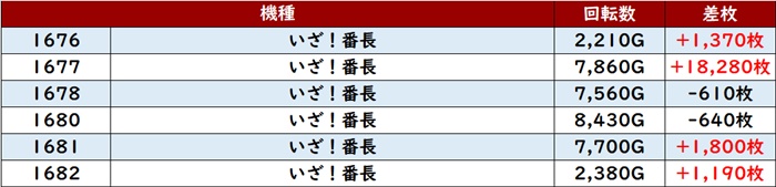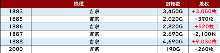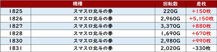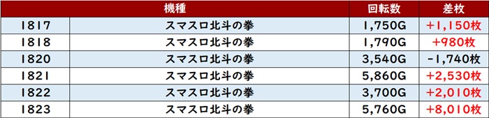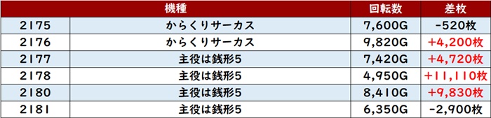 差枚数+1.1万枚超えを始め、6台中4台が差枚数+4,200枚以上の大幅プラス差枚となっており、盛り上がりを後押ししていた。