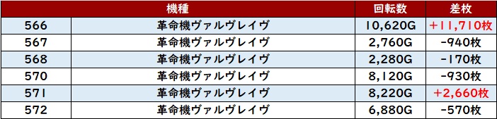 また「ヴヴヴ 566~572」から抜群の数値を記録する台を目撃!