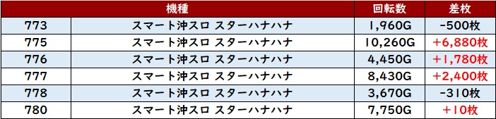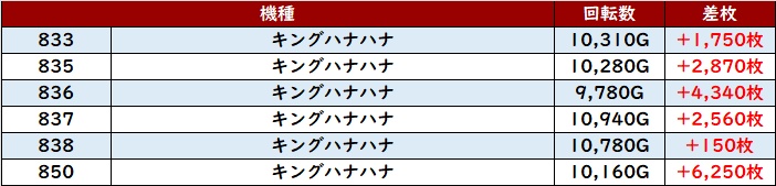まずは「キンハナ 833~850」差枚数+6,250枚を筆頭に、殆どが大幅プラス差枚と盛り上がりに貢献!