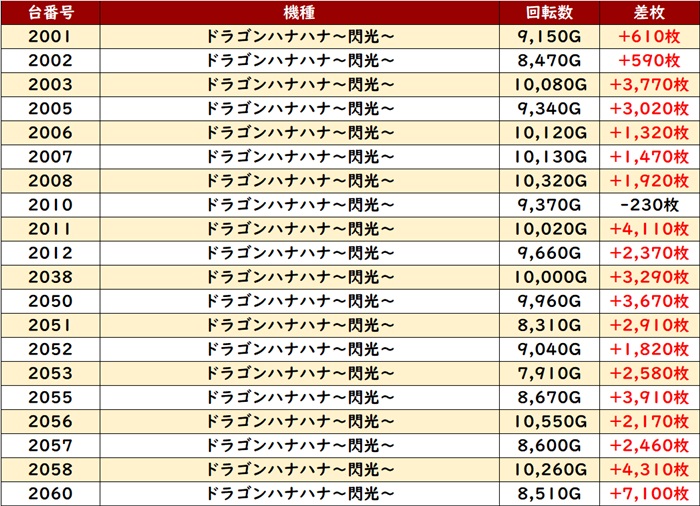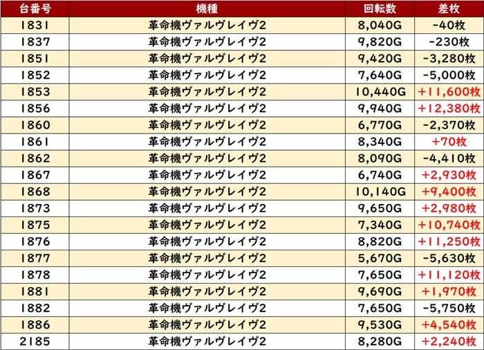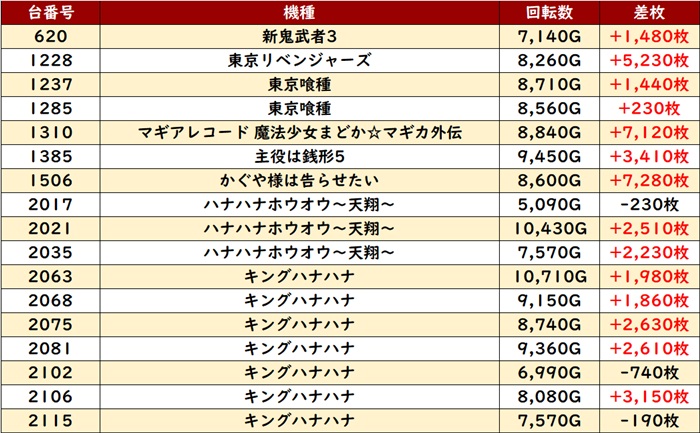 台の驚異的なポテンシャルを存分に発揮し、差枚数+1万枚超えが5台と衝撃の結果を叩き出した!