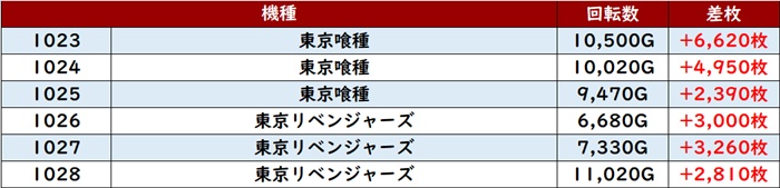 まずは「東京喰種~東京リベンジャーズ 1023~1028」の半数が回転数1万G超えと大熱狂!