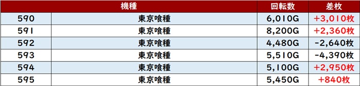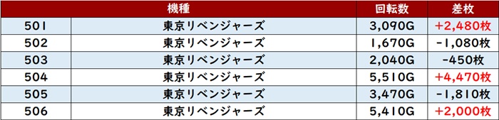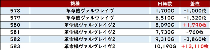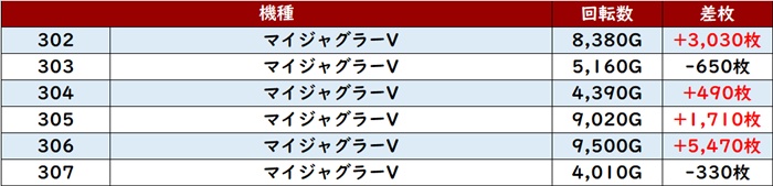 大幅に出玉感を伸ばす台が半数以上を占めており、差枚数+5,200枚超えが2台も確認できた!