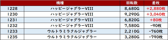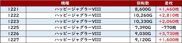 続いて「ハッピー3 1221~1227」6台中5台が大幅プラス差枚と絶好調!