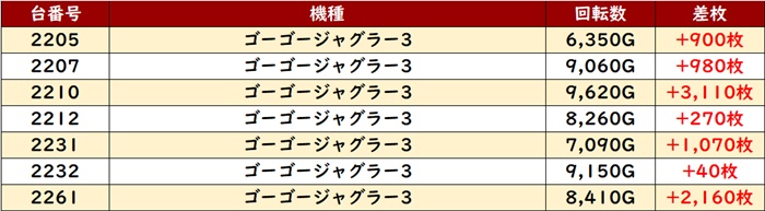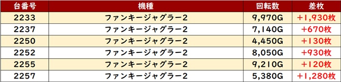 他にも「ファンキー2」「ゴージャグ3」といった「ジャグラーシリーズ」も好調台が多数見られ、ユーザー達の期待感に応えていた。