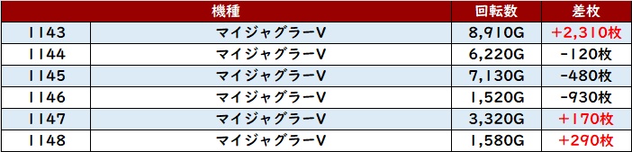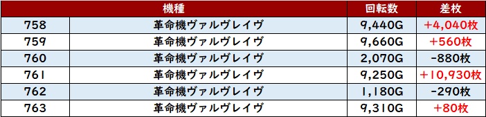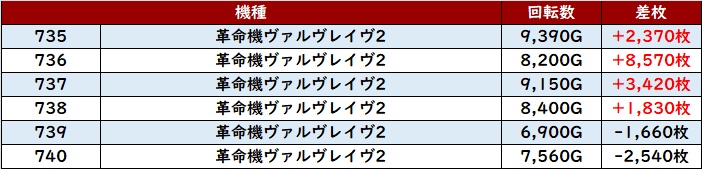 続いて「ヴヴヴ2 735~740」が大半が回転数8,200G以上且つ大幅プラス差枚と盛り上がりにしっかりと貢献!