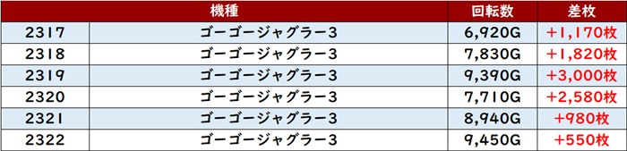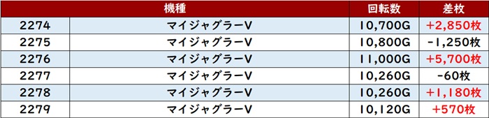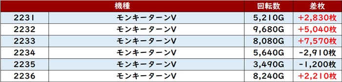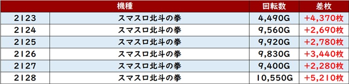 まずは「スマスロ北斗 2123~2128」が全台差枚数+2,200枚超えと驚異的な盛り上がりに!