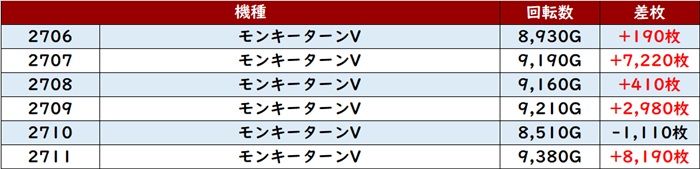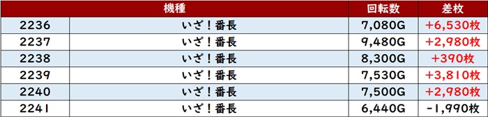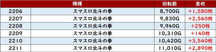 まずは「スマスロ北斗 2206~2211」が全台プラス差枚と絶好調!