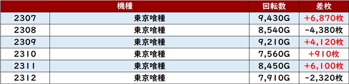 朝イチは「スマスロ化物語」「ヴヴヴ2」「東京喰種」「東京リベンジャーズ」「モンキー5」「かぐや様」「新鬼武者3」「スマスロ北斗」から埋まっていった。