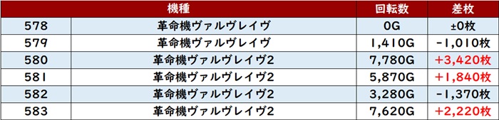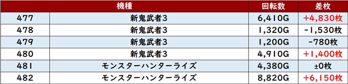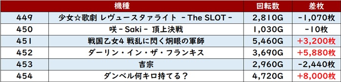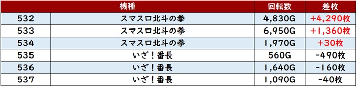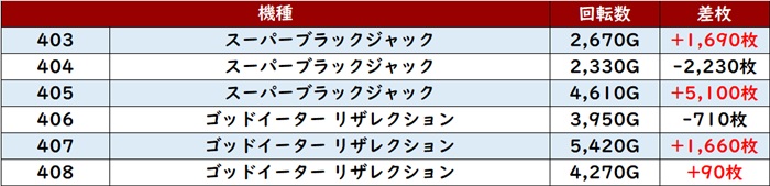 こちらも苦戦している台が多く見られたが、半数が大幅プラス差枚を記録し、スロットコーナー内に爪痕を残していた。