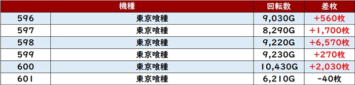 まずは「東京喰種 596~601」半数以上が回転数9,000G超えと凄まじい勢いに!