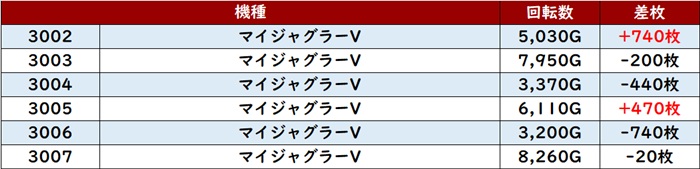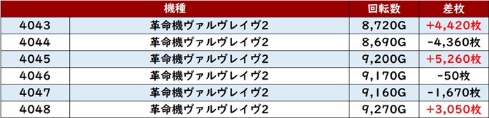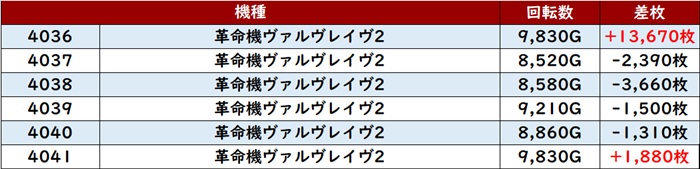 まずは「ヴヴヴ2 4036~4041、4043~4048」から驚異の差枚数+13,670枚を筆頭に、大きく出玉感を伸ばす台を複数目撃!