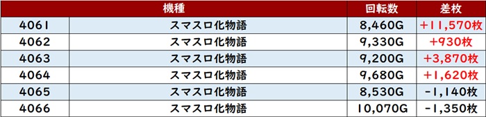 また「スマスロ化物語 4061~4066」全台回転数8,400G超えと大盛況!