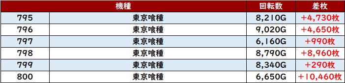 続いて「東京喰種 795~800」が差枚数+10,460枚を筆頭に勝率100%を記録!