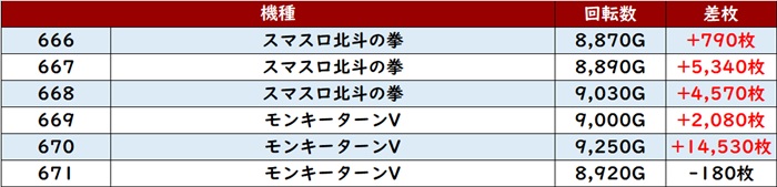 まずは「スマスロ北斗~モンキー5 666~671」が回転数8,800G超えと凄まじい勢いに!