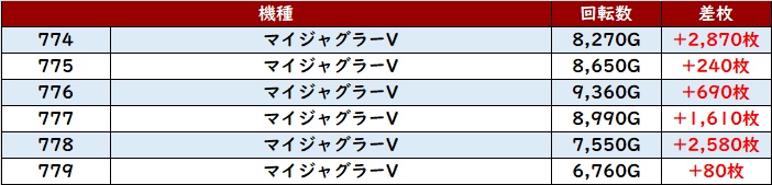 まずは「マイジャグ5 774~779」が全台プラス差枚と盛り上がりの主役に!