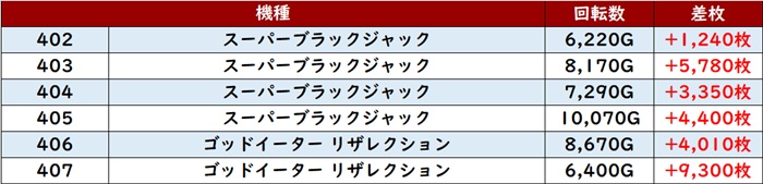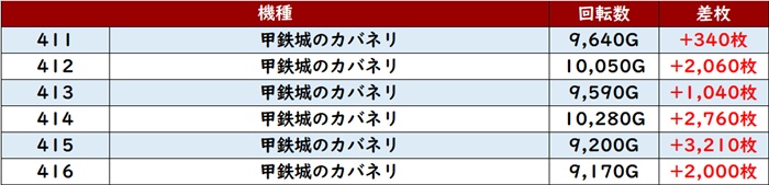 まずは「カバネリ 411~416」全台プラス差枚と文句無しの結果に!