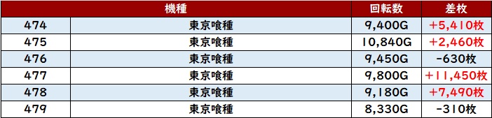 更に「東京喰種 474~479」も殆どが回転数9,100G超えと熱気溢れる稼働の高さに!