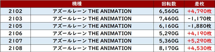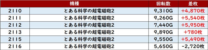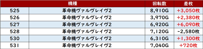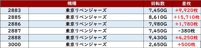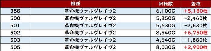 殆どが回転数9,000G超えと熱気に包まれており、差枚数+5,790枚を叩き出す台を筆頭に凄まじい出玉感となった。
