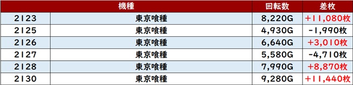 まずは「東京喰種 2123~2130」が差枚数+1.1万枚超えを2台引っ提げて、驚異的な活躍に!