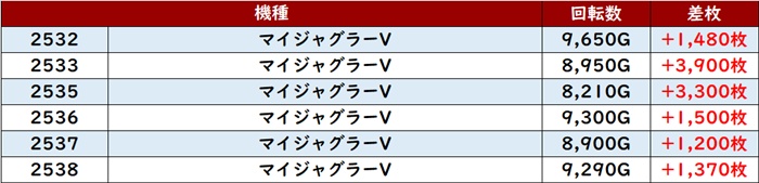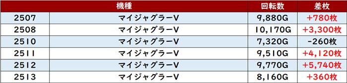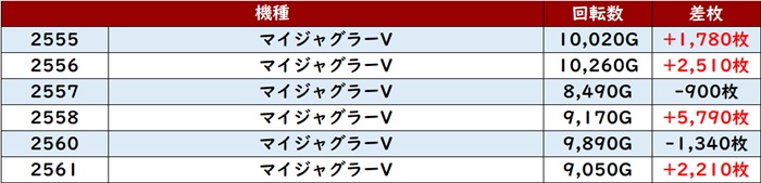 更に「マイジャグ5」は3箇所で賑わいを見せ、18台中15台がプラス差枚と圧巻の光景に!