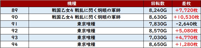 まずは「乙女4~東京喰種 89~94」から差枚数+1万枚超えと大台突破する台を発見!
