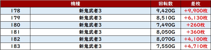 続いて「新鬼武者3」が全台プラス差枚とポテンシャルを発揮!