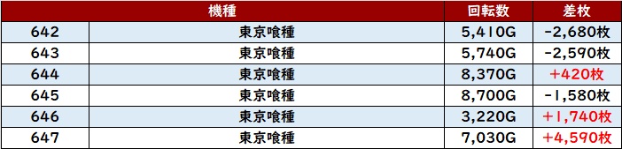 朝イチは「スマスロ化物語」「東京喰種」「ヴヴヴ」「スマスロゴッドイーター」の順に満台となり、「マイジャグ5」が8割稼働となった。