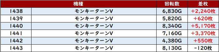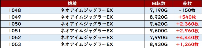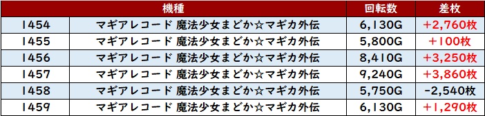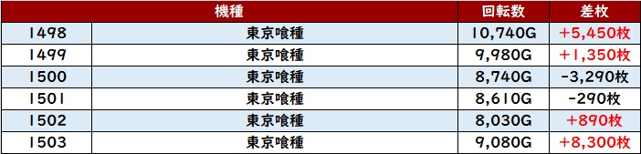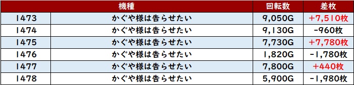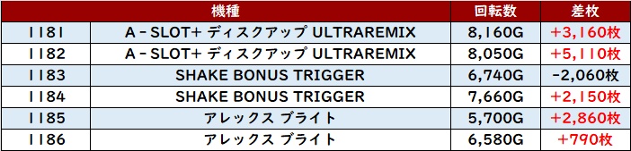 計12台中8台が回転数9,100G超えと素晴らしい稼働の高さを伴って、差枚数+8,540枚を筆頭に大幅プラス差枚となる台が続出した!
