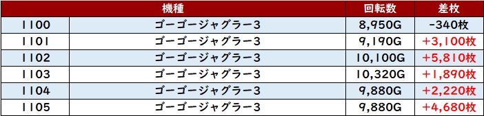続いて「ゴージャグ3 1100~1105」も全台回転数8,900G超えと圧巻の稼働状況に!