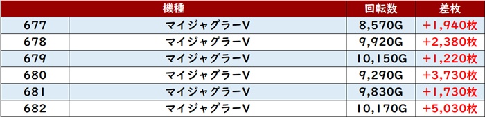 まずは「マイジャグ5 677~682」が全台大幅プラス差枚と絶好調!