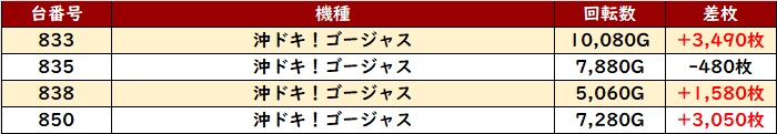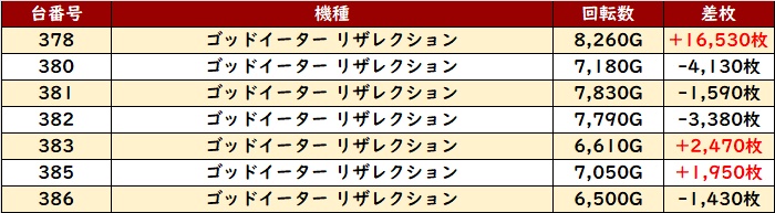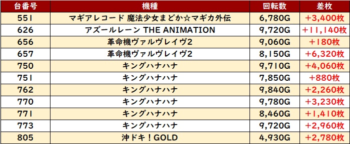 回転数9,400G超え且つ大幅プラス差枚を記録する台が複数散見され、状況の良さを物語っていた。