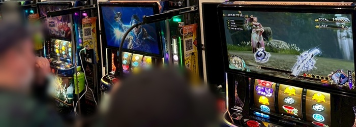 朝イチは「スマスロ化物語」「東京喰種」「ヴヴヴ2」「モンキー5」「東京リベンジャーズ」の順で埋まり、入場終了後にはスマスロ主要機種がほぼ満台となった。
