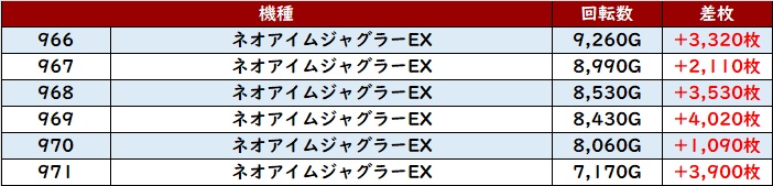 まずは「ネオアイム 966~971」の殆どが回転数8,000G超えの高稼働に!